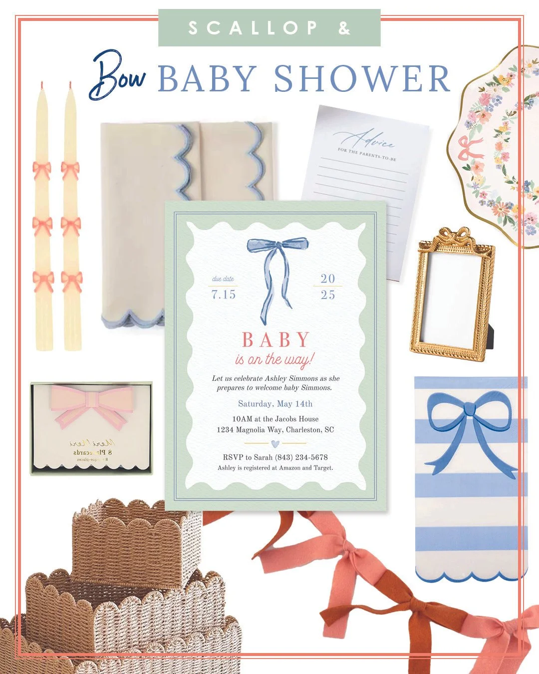 Scroll down to explore our curated collection of scallop & bow inspired invitations, along with perfect party essentials - from plates and baskets to candles and more! It’s everything you need to host the Sweetest “Tied with Love “ Baby Shower.